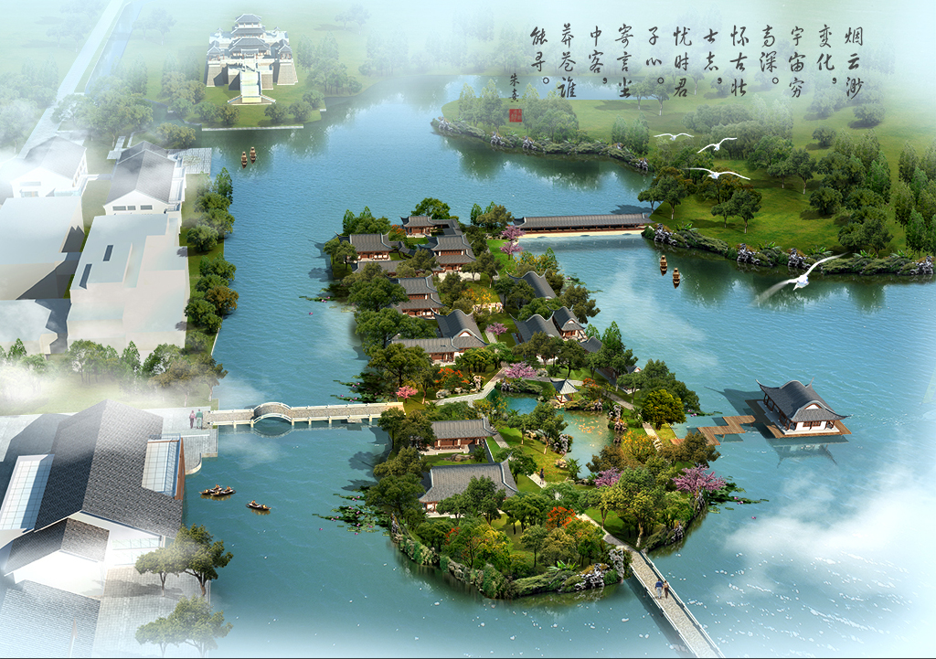 蘇州園林鳥瞰圖濕地濱水園林景觀psd素材下載