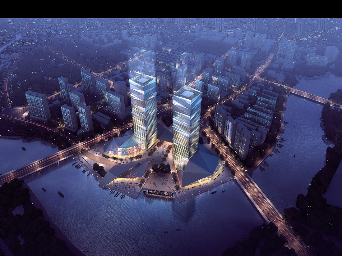 城市江邊大廈夜景鳥瞰圖后期psd素材源文件分層圖層